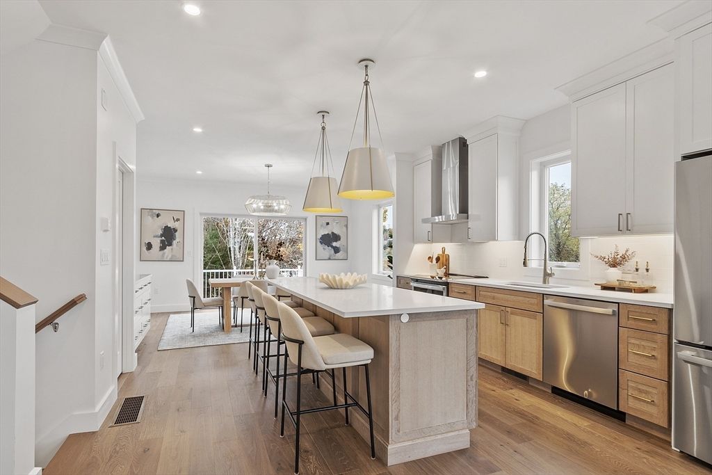 Dining Room: Deck - Exterior, Open Floorplan, Recessed Lighting, Slider, Crown Molding, Flooring - Engineered Hardwood